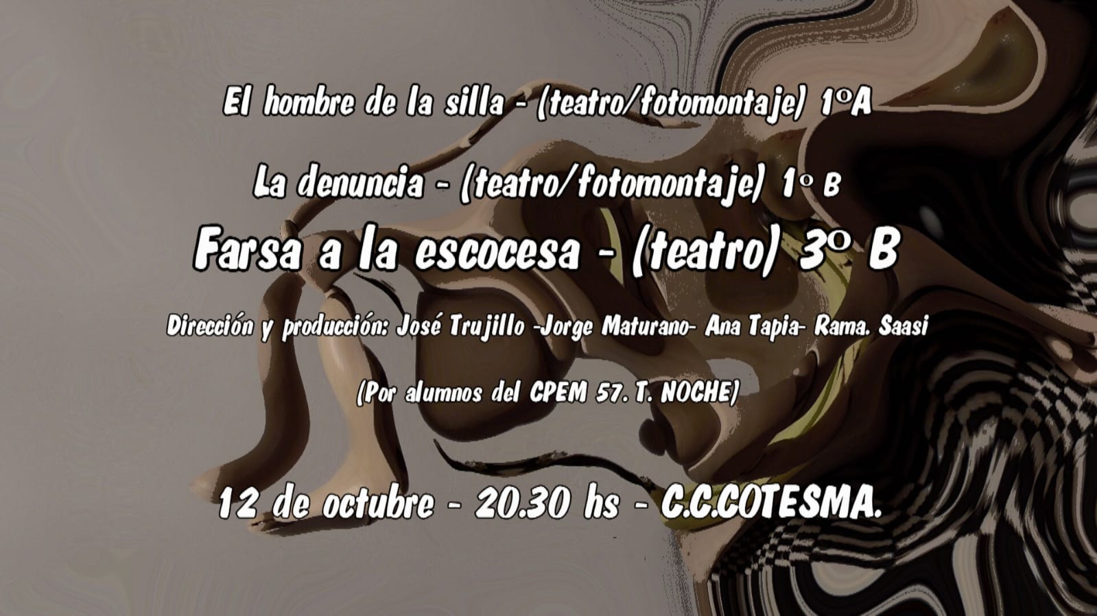 Los alumnos del turno noche del CPEM 57 exhibirán una vez más, en el CENTRO CULTURAL COTESMA, el próximo 12 de octubre, 3 obras de teatro: “El hombre de la silla”, “La denuncia” realizadas con fotomontaje y “Farsa a la Escocesa”, del autor Román Sarmentero, representada por alumnos de 3ºB del turno noche. La dirección y producción está a cargo de José Trujillo y Jorge Maturano, con la colaboración de Ana María Tapia.