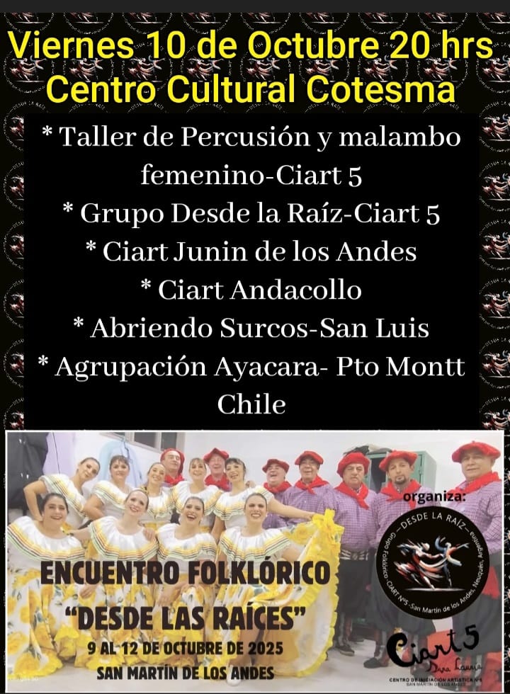 El 10 de octubre a partir de las 20:00hs comienza el Encuentro Folklórico "Desde las Raíces" donde participarán delegaciones de San Luis, Chile, Andacollo y Junín de los Andes, además de presentarse el grupo "Desde la Raíz" del Ciart 5 y los talleres de Percusión y Malambo femenino.