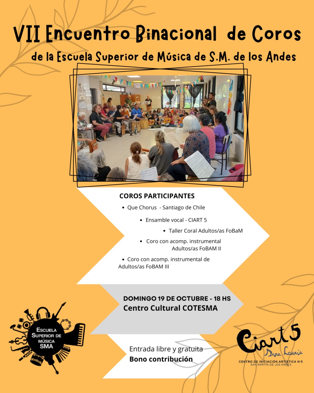 Invitamos el dia domingo 19 de octubre a las 18hs al concierto de cierre del VII Encuentro Binacional de Coros. Luego de un fin de semana de encuentro y creación colectiva, cada agrupación coral presentará un repertorio de canciones de la musica popular para finalizar presentando una obra conjunta.